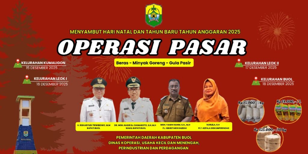 Pemerintah Daerah Kabupaten Buol melalui Dinas Koperasi, Usaha Kecil dan Menengah, Perindustrian dan Perdagangan akan menggelar Operasi Pasar Murah untuk menjamin ketersediaan dan stabilitas harga kebutuhan pokok menjelang Hari Natal 2025 dan Tahun Baru 2026. Ini kesempatan bagi warga Buol untuk mendapatkan kebutuhan pokok dengan harga terjangkau!