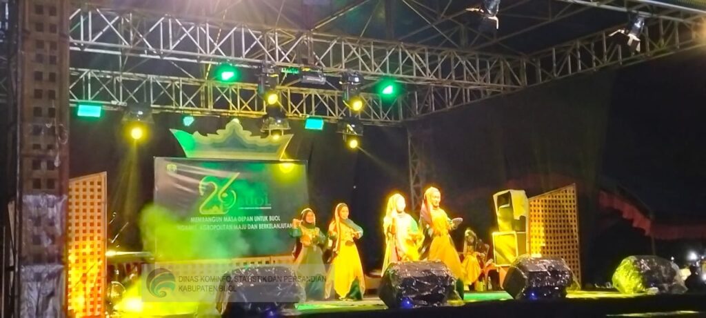 Rangkaian pertunjukan malam itu menampilkan beragam seni dan budaya dari kelompok masyarakat di Kabupaten Buol. Pembuka acara diisi dengan Tari Monamot.