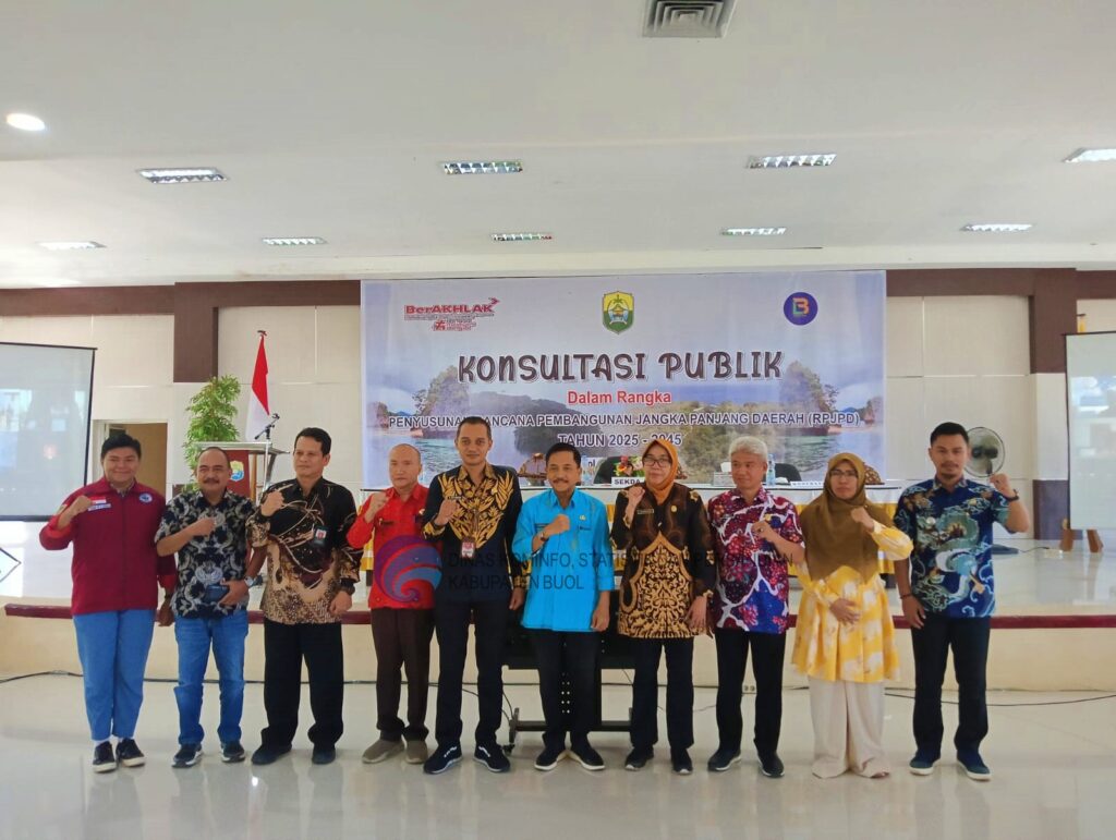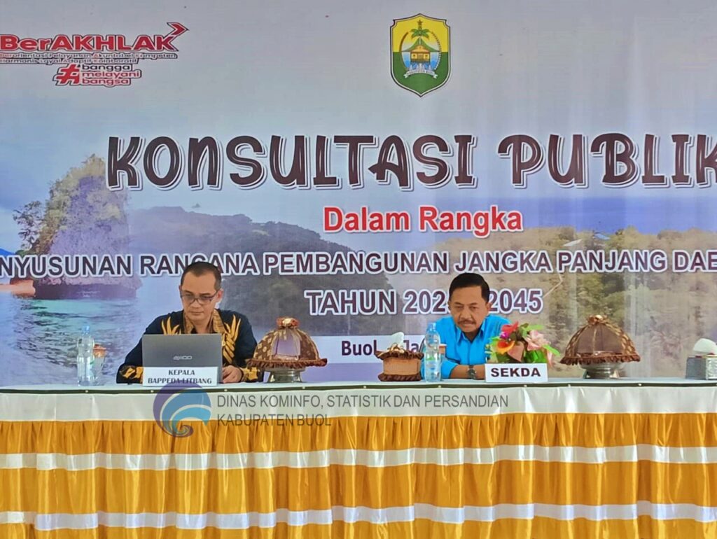Sekretaris Daerah Kabupaten Buol, Drs. Mohammad Suprizal Jusuf, MM mewakili Pj. Bupati Buol, Drs. M. Muchlis, MM membuka kegiatan konsultasi publik untuk penyusunan Rencana Pembangunan Jangka Panjang Daerah (RPJPD) 2025-2045. Acara berlangsung di aula lantai II kantor Bupati Buol, Kamis 25 Januari dan dihadiri oleh berbagai pihak, termasuk forum komunikasi pimpinan daerah, Asisten Setda Kabupaten Buol, staf ahli, pimpinan perangkat daerah, serta tokoh masyarakat.