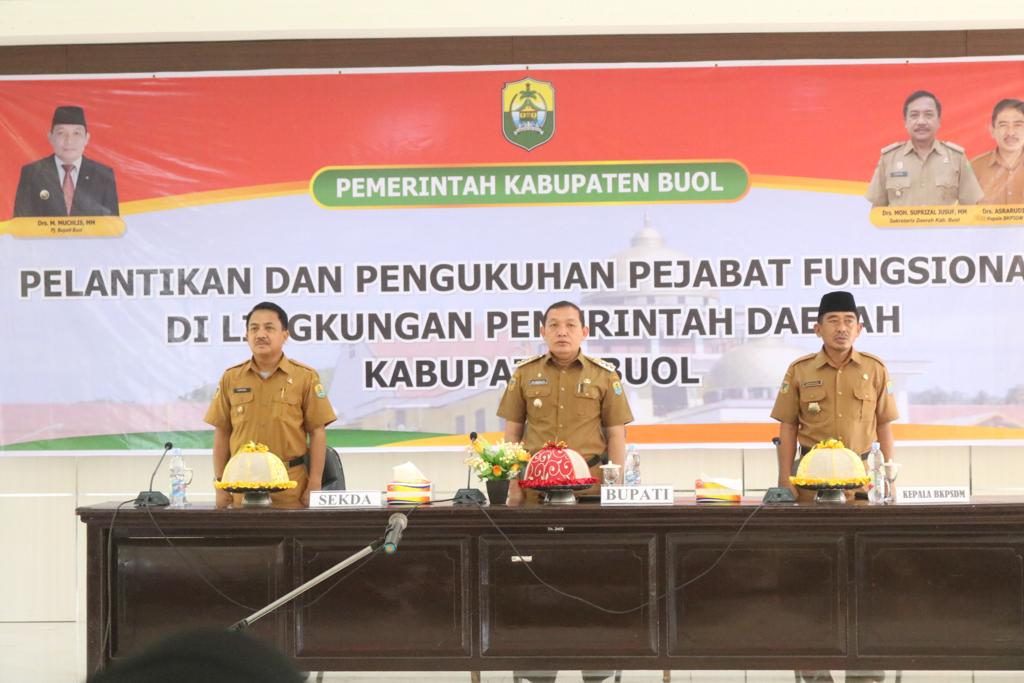 Sebanyak 99 Pejabat Fungsional dilantik dan dikukuhkan. Pj Bupati Buol, Drs. M. Muchlis, MM secara resmi melantik dan mengukuhkan pejabat fungsional yang dilanjutkan dengan pengambilan sumpah jabatan. Kegiatan ini dilaksanakan di Aula Lantai II Kantor Bupati Buol, Senin, (13/3).