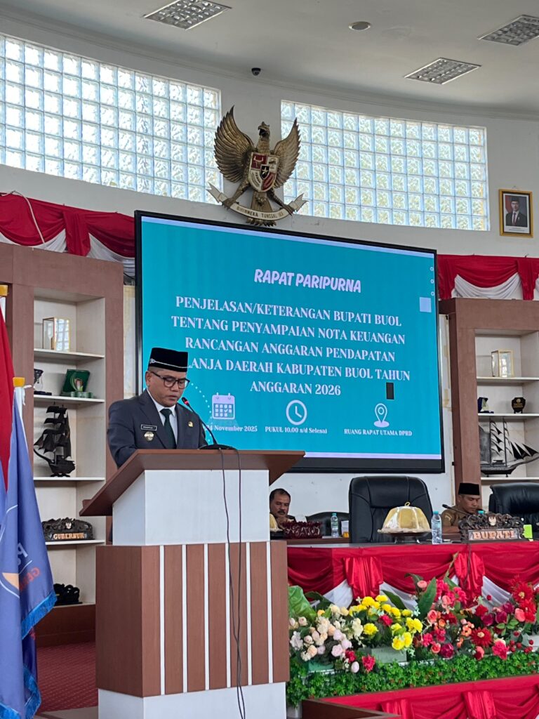 Pemerintah Kabupaten Buol menyampaikan Nota Keuangan Rancangan APBD Tahun Anggaran 2026 dalam Rapat Paripurna DPRD yang digelar di Ruang Rapat Utama DPRD Kabupaten Buol pada Senin, 24 November 2025. Rapat dipimpin langsung oleh Ketua DPRD Kabupaten Buol, Ryan Nathaniel Kwendy, dan dihadiri oleh Bupati Buol, H. Risharyudi Triwibowo, jajaran pimpinan DPRD, Forkopimda, para kepala perangkat daerah, serta insan pers.