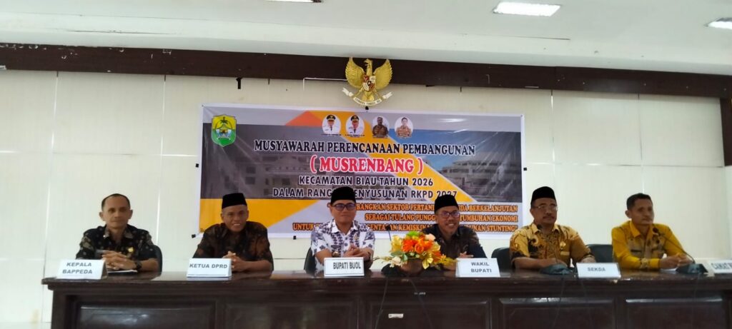 Pemerintah Kabupaten Buol menggelar Musyawarah Perencanaan Pembangunan (Musrenbang) Tingkat Kecamatan Biau Tahun 2026 yang dibuka langsung oleh Bupati Buol H. Risharyudi Triwibowo, Kamis (26/2/2026), bertempat di Aula Pobokidan Lantai II Kantor Bupati Buol. Kegiatan ini menjadi bagian strategis dalam rangka penyusunan Rencana Kerja Pemerintah Daerah (RKPD) Kabupaten Buol Tahun 2027 melalui pendekatan partisipatif berbasis kebutuhan masyarakat. Ini merupakan Musrenbang ketiga, setelah sebelumnya Kecamatan Paleleh dan Paleleh Barat.