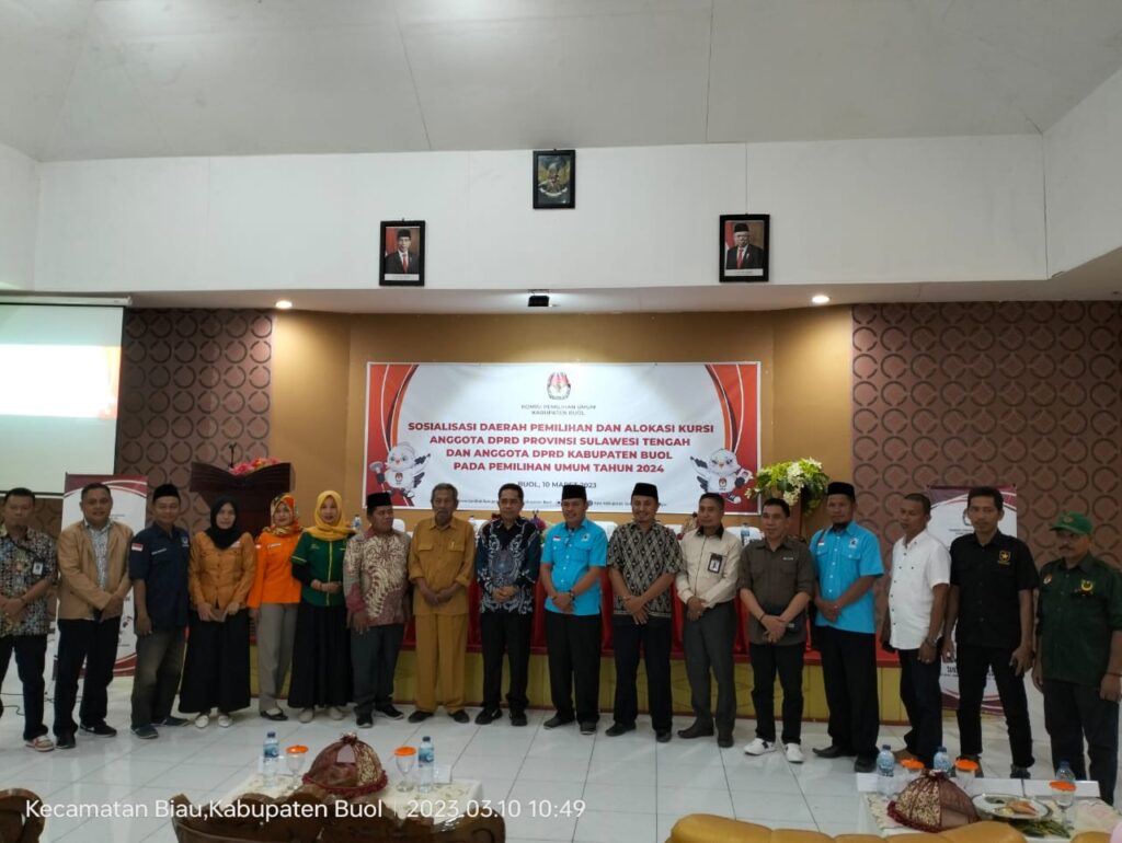 Kegiatan sosialisasi ini dihadiri oleh Drs.Muchlis Yodjodolo, MM; anggota KPU Provinsi Sulawesi Tengah, DR. Sahran Raden S. Agar. SH. MH; Ketua KPUD Buol, Alamsyah SE; Danramil 1305-05 Biau, Lettu Inf. Askari Djabar; Kadis Kominfo, Soundo S. Sos; Kaban Kesbangpol, Drs. Mansyur AR. Hentu; Komisioner Hukum KPU Buol, Saprudin Lamata SH; Kepala Sekertariat Bawaslu Kab. Buol, Moh. Singara S. Ag. M.Si; Komisioner Sosialisasi dan Partisipasi Masyarakat KPU Buol, Ali. S. Si; Komisioner logistik KPUD Buol,Sudirman SP; Sekertaris KPU Buol, Rusli D. Ali S. Sos, serta para pimpinan partai serta tamu undangan lainnya.